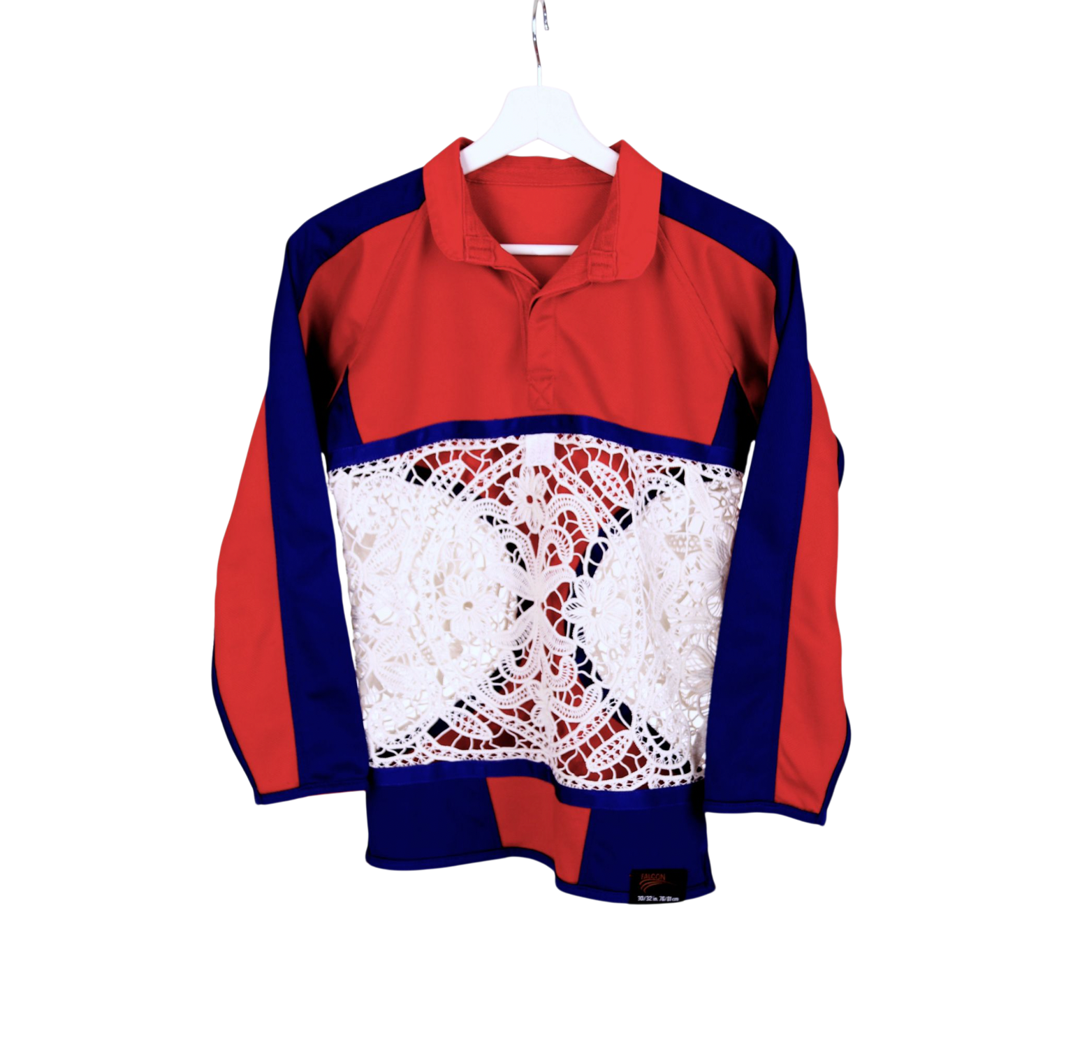 Piece made from a mix of second-hand jumper with a hand-made vintage crocheted table runner in cotton yarn. The item is unique and the join between the two textile is done in cotton gross-grain tape. The item is gender fluid.