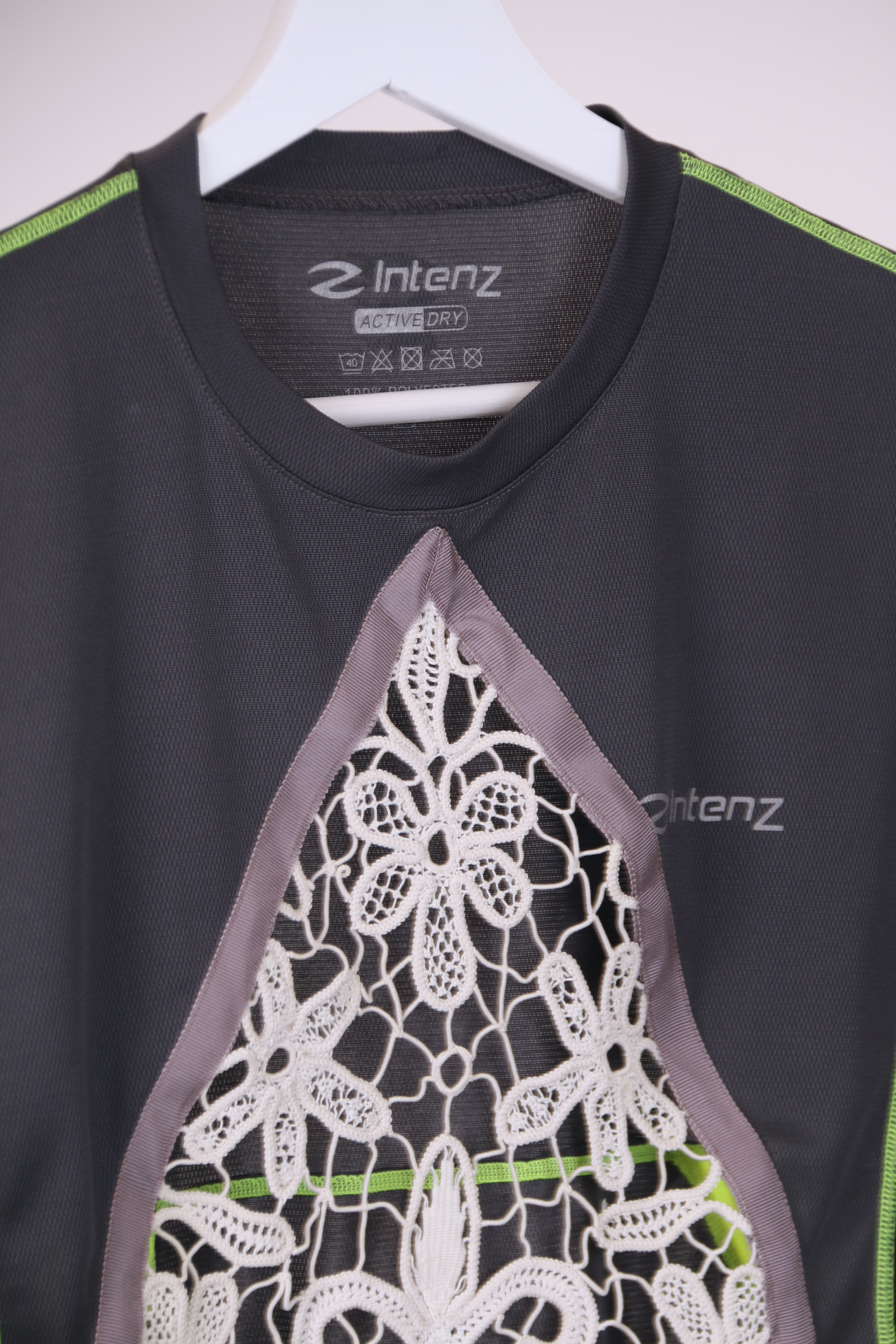 T-shirt made from a mix of second-hand jumper with a hand-made vintage crocheted table runner in cotton yarn. The item is unique and the join between the two textile is done in cotton gross-grain tape. The item is gender fluid.